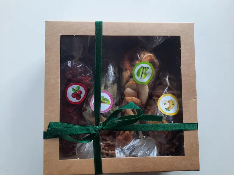 Žāvētu augļu komplekts dāvanu kastītē. Žāvētas dzērvenes, cidonijas, āboli, rabarberi.